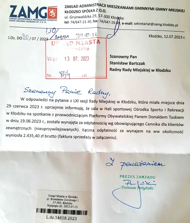 Kłodzko. Radny Stanisław Bartczak (PiS) zadał w tej sprawie oficjalne pytanie na sesji Rady Miejskiej w Kłodzku i otrzymał odpowiedź z dołączoną kopią faktury. Wynik z niej, że za wynajęcie hali na spotkanie z Tuskiem organizatorzy zapłacili 2 435 zł brutto.