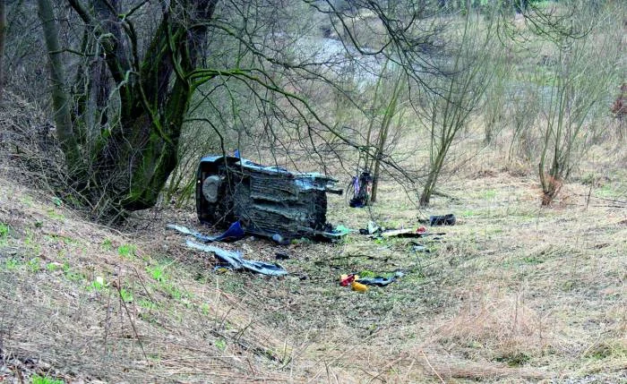 Rozbite auto to jasnoniebieski Ford Focus. Nie ma tablic rejestracyjnych i szyb - przedniej i tylnej. Prawdopodobnie leżące na skarpie auto wcale nie jest efektem wypadku, tylko świadomego porzucenia, a właściwie dzikiego zezłomowania.