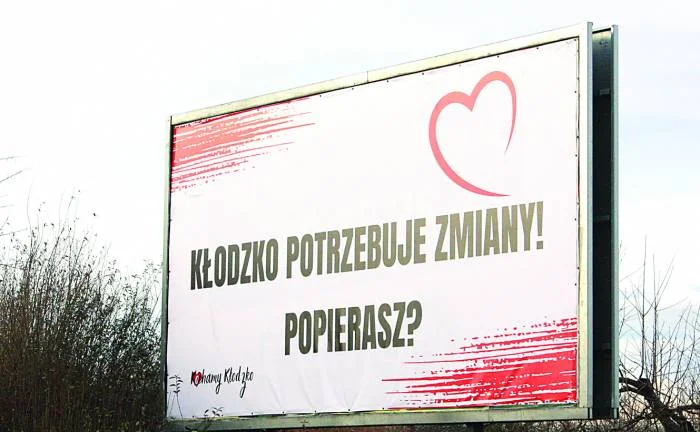 Na plakacie jest jedno hasło: Kłodzko potrzebuje zmiany. Pod nim pytanie: Popierasz? I w rogu coś a` la podpis: Kochamy Kłodzko. Uwagę zwraca element graficzny umieszczony w prawym górnym rogu billboardu - czerwone serce, łudząco podobne do tego używanego przez Koalicję Obywatelską podczas wyborów parlamentarnych.