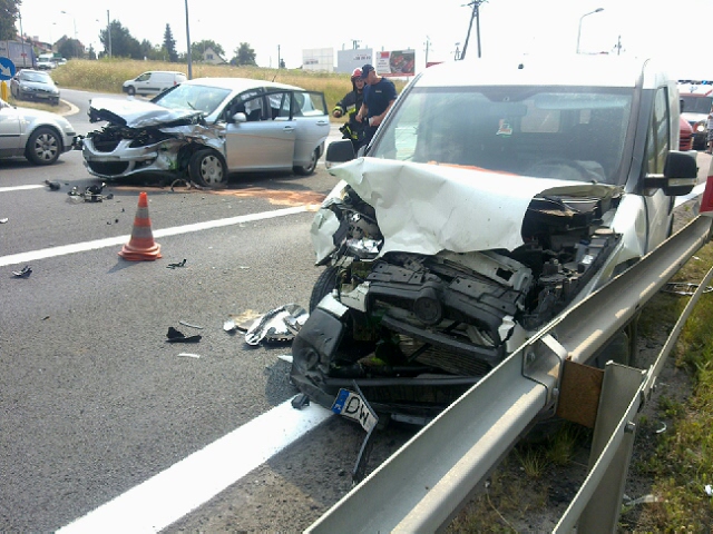 Osobowy Seat Toledo na rejestracjach DKL (powiat kłodzki) i Fiat Doblo (rejestracje wrocławskie) zderzyły się ok. godz. 15.00 na skrzyżowaniu drogi krajowej nr 8 z ul. Warty. Z nieoficjalnych informacji wynika, że trzy osoby trafiły do szpitala.