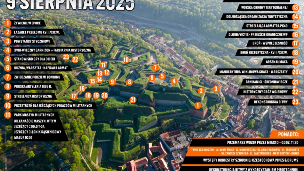 Na terenie Twierdzy Kłodzko przygotowano kilkadziesiąt stoisk i atrakcji: od prezentacji wojskowego sprzętu – armat, pojazdów gąsienicowych i czołgów – po warsztaty rzemieślnicze, takie jak wikliniarstwo czy pokaz naprawy armat. Dla najmłodszych przygotowano specjalne gry terenowe i stanowiska edukacyjne, a zwiedzający będą mogli zajrzeć w miejsca na co dzień niedostępne, w tym podziemia Donjonu czy historyczne obozy wojskowe.