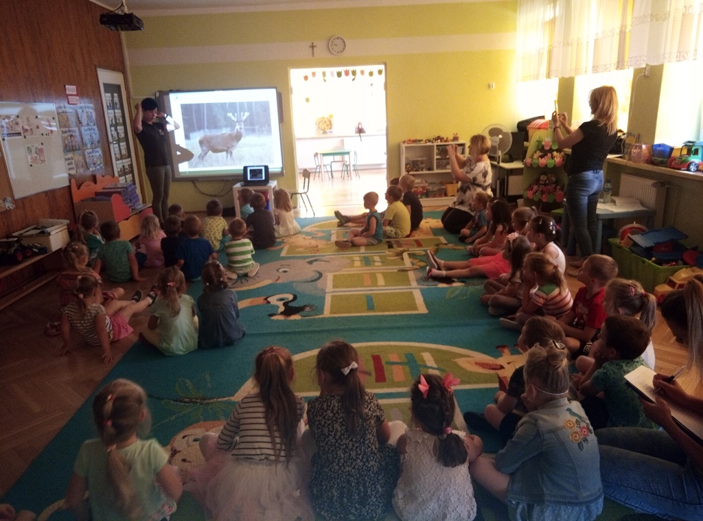 Najmłodszych odwiedziła Magdalena Mol, specjalista do spraw ochrony lasu, turystyki i edukacji z Nadleśnictwa Bystrzyca Kłodzka. Podczas spotkania na pierwszy ogień trafił pokaz slajdów o zwierzętach żyjących w środowisku leśnym, takich jak jelenie, sarny, daniele, borsuki, lisy, kuny leśne, tchórz, dziki, zające, jenoty, ale też o tych zamieszkujących środowisko wodne jak bobry czy wydry. Nie mogło zabraknąć informacji o malutkich gryzoniach i zwierzątkach, które również można spotkać na naszych terenach, a są nimi wiewiórki, kuny domowe, popielice, orzesznice. Dzieci dowiedziały się też, gdzie można spotkać dane zwierzę. Ciekawą niespodzianką był pokaz poroży z wyjaśnieniami, do kogo należą.... Był też czas na zadawanie pytań. Pani leśnik zdradziła nam, że wraz z kolegą prowadzą pokazy na które przyjeżdżają z prawdziwymi sowami, ale zastrzegła, że dzieci muszą być bardzo cicho - bo sowy mają tak doskonały słuch, że potrafią usłyszeć z odległości 60 metrów bicie serca myszy.